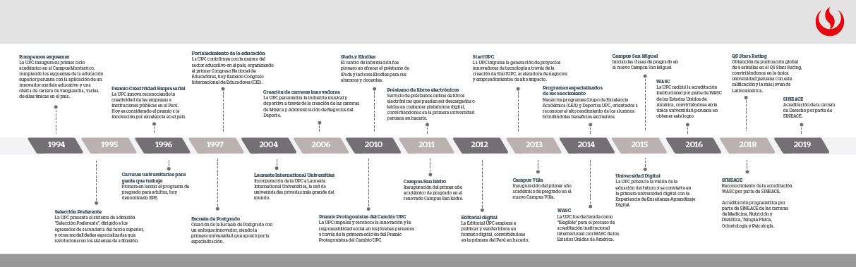 Universidad Peruana de Ciencias Aplicadas (UPC) was born in 1994 as an educational institution based on creativity and innovation, oriented to train future professionals, who will be the protagonists of the transformation of our country. It was created by Law 26276, dated January 5, 1994, and since September 2004 it is part of Laureate International Universities, the largest network of private universities in the world.