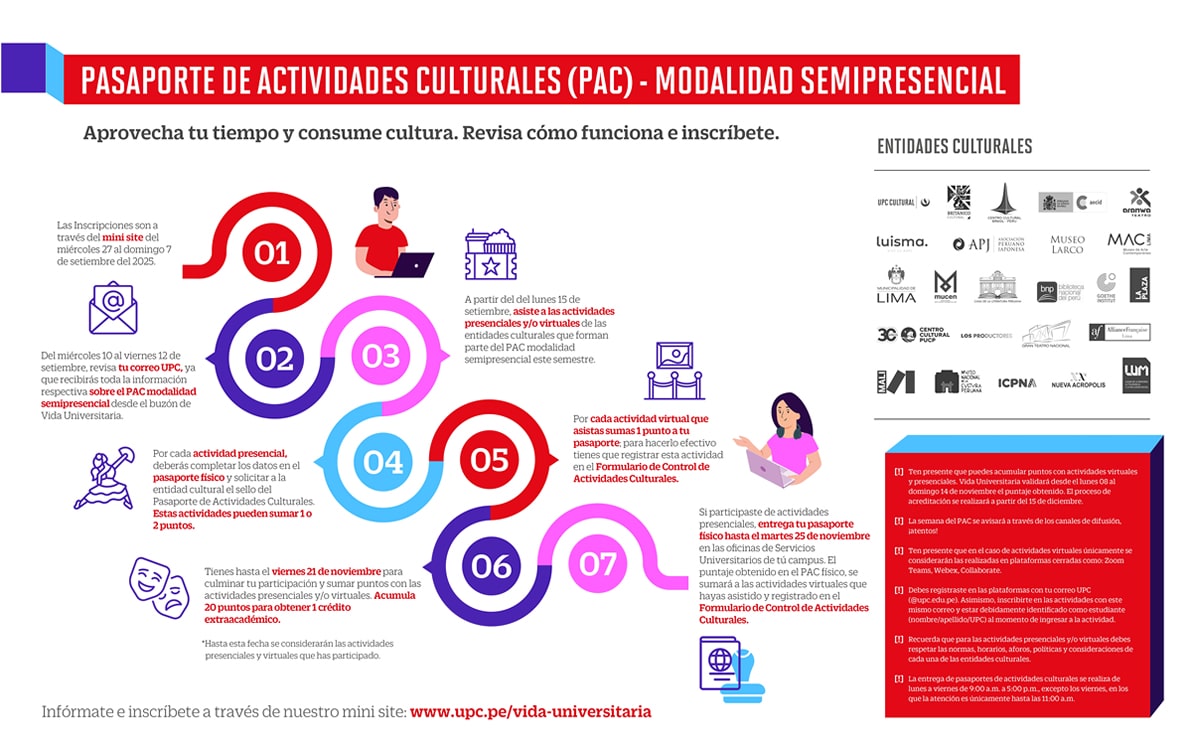 Revisa la siguiente infografía para conocer el paso a paso del Pasaporte de Actividades Culturales - modalidad semipresencial a partir de este semestre.